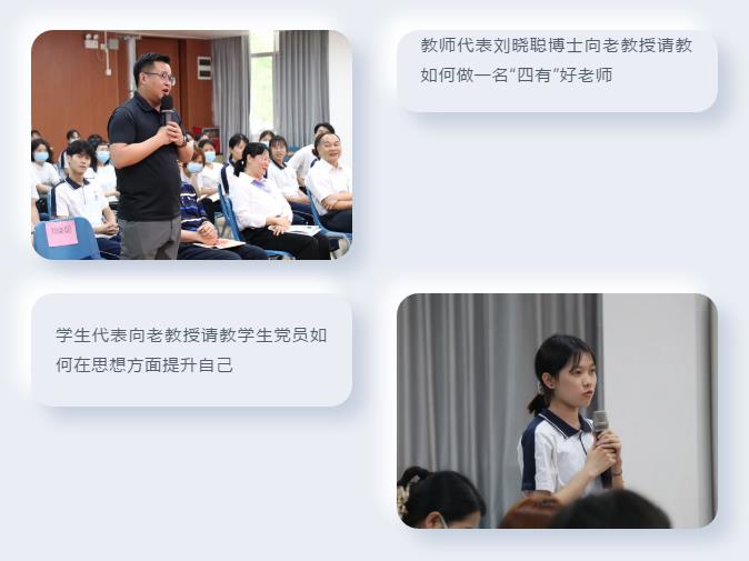 面对现场师生踊跃的提问,三位老教授结合自身经历,深入浅出地做了回答。他们鼓励青年老师多读党史,在党的发展历程中汲取宝贵经验,虚心向老前辈求教;提醒同学们不断学习,提升自我,要做到端正入党动机,准确认识自我,找准定位才能更好的学习工作。