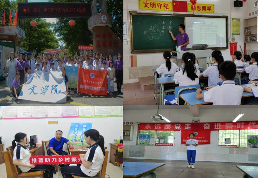 另外,为了迎接第24届全国推普活动周,暑假期间文学院“推普筑梦义教”志愿服务队在四会市龙甫学校开展了与推普有关的社会实践活动,龙甫学校的领导班子、学生家长及三下乡社会实践活动带队老师共同参与其中。朗诵、书法展示、讲党史故事、作文展示等师生喜闻乐见的活动形式,增强了活动的效果。