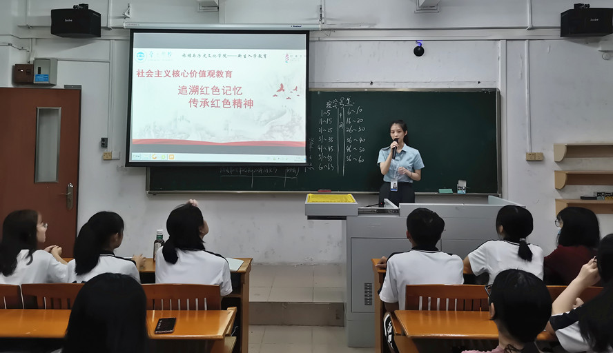 此外,经过前期选拔、培训,成立学院志愿者宣讲队。欧晓玲、梁思华、林羽彤等同学走进新生班级,结合肇庆市市红色历史文化、红色旅游景点开展宣讲活动,为同学们讲述红色故事、传承红色精神。