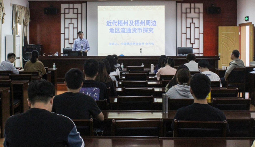下午,余天佑又为我校师生带来了以“近代梧州及周边地区流通货币探讨”为主题的讲座。讲座介绍了梧州的发展历史,从从晚清时期流通货币、民国时期流通货币、香港货币在近代梧州的流通、外国银币及铜币/纸币在近代梧州的流通这四个方面阐述梧州近代货币的发展进程。余天佑认为,近代梧州货币体系艰难转型的历程,体现了近代中国经济的脆弱及货币主权丧失的弊端,即使近代西江流域商品经济繁荣,但没有一个讲定的货币主权的条件,商品经济只能是“镜中之花”。