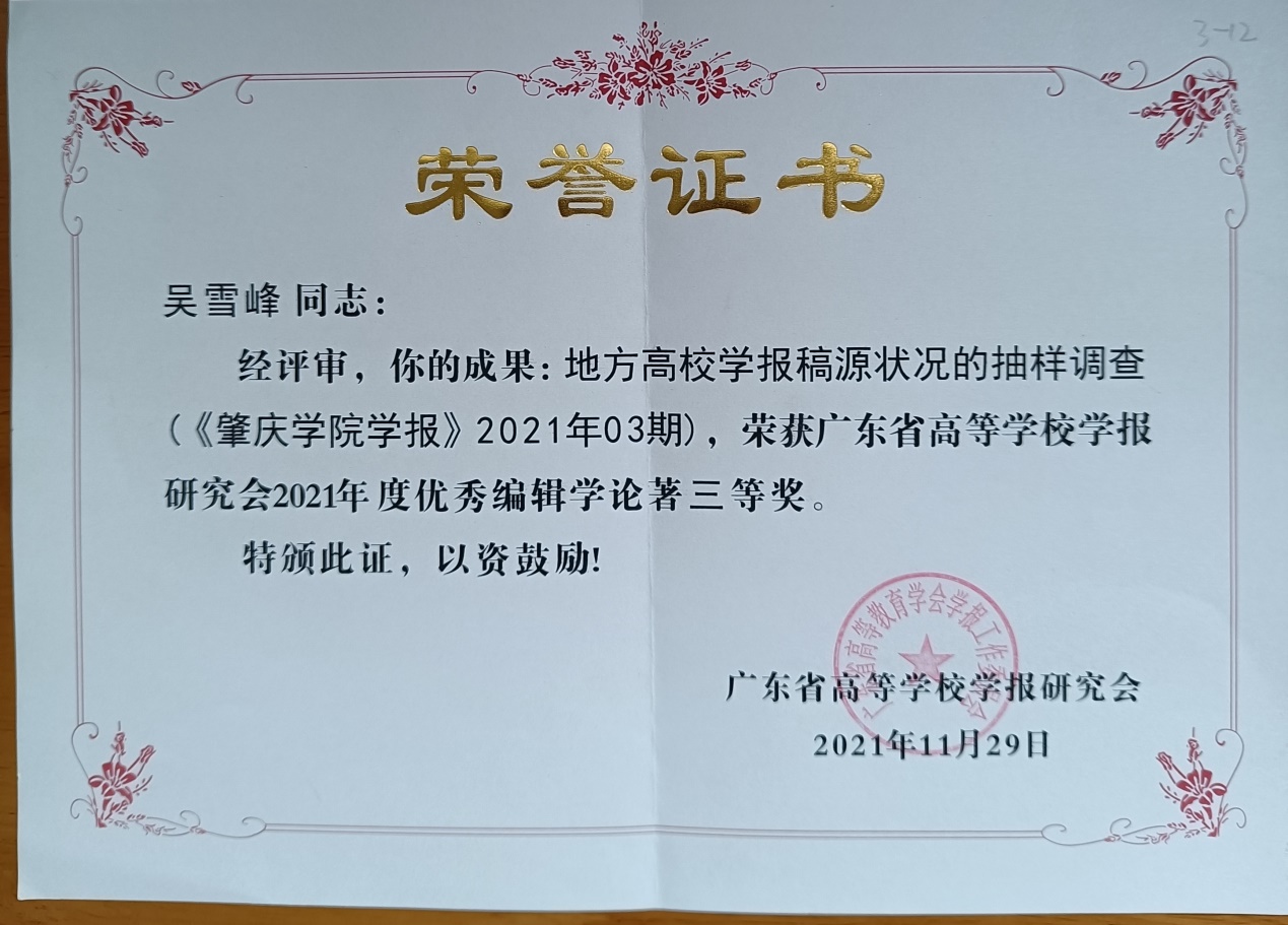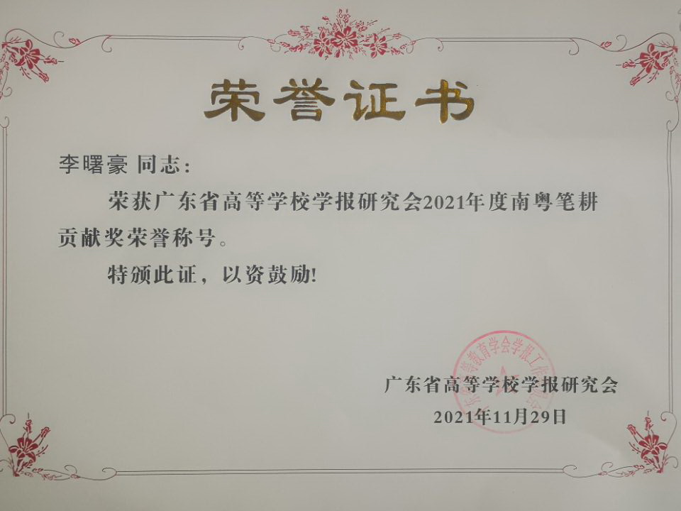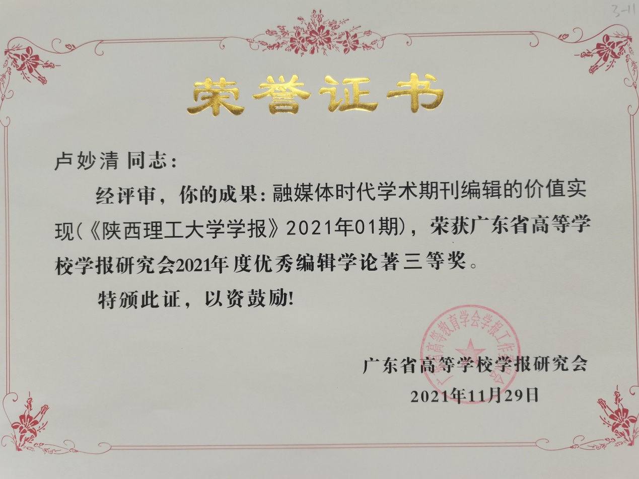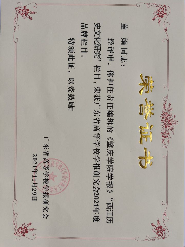 会议评选出南粤优秀笔耕贡献奖、优秀编辑学论著、品牌栏目、优秀青年编辑等奖项,并进行了颁奖。我校在此次评奖中荣获多项奖励,包括李曙豪荣获南粤笔耕贡献奖,董娟老师担任责任编辑的《必赢242net官网学报》“西江历史文化研究”栏目获评品牌栏目,卢妙清老师、吴雪峰老师的论文荣获优秀编辑学论著三等奖。