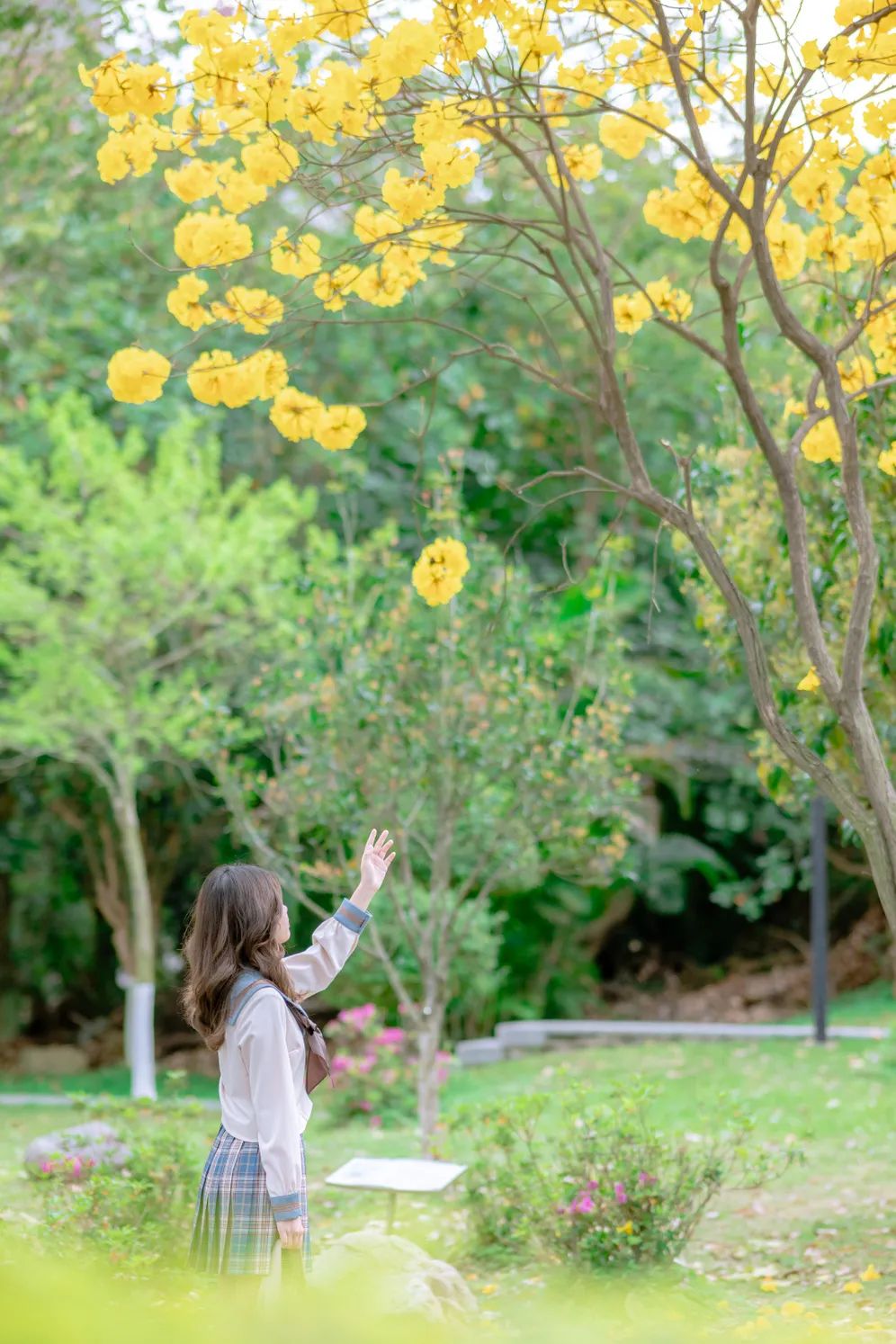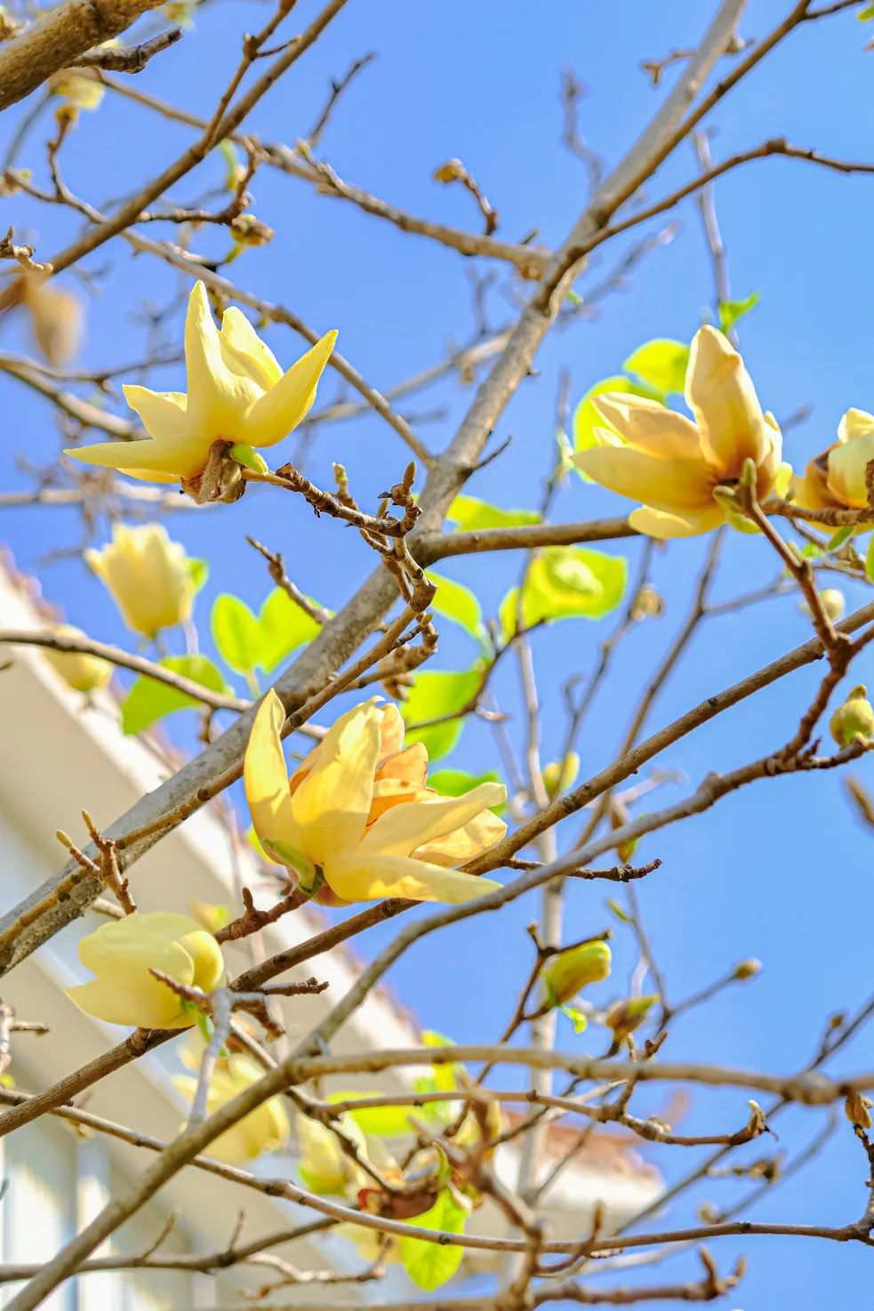 鹅黄色的黄花风铃木倒挂枝头,在澄澈蓝天的衬托下,更显青春烂漫。