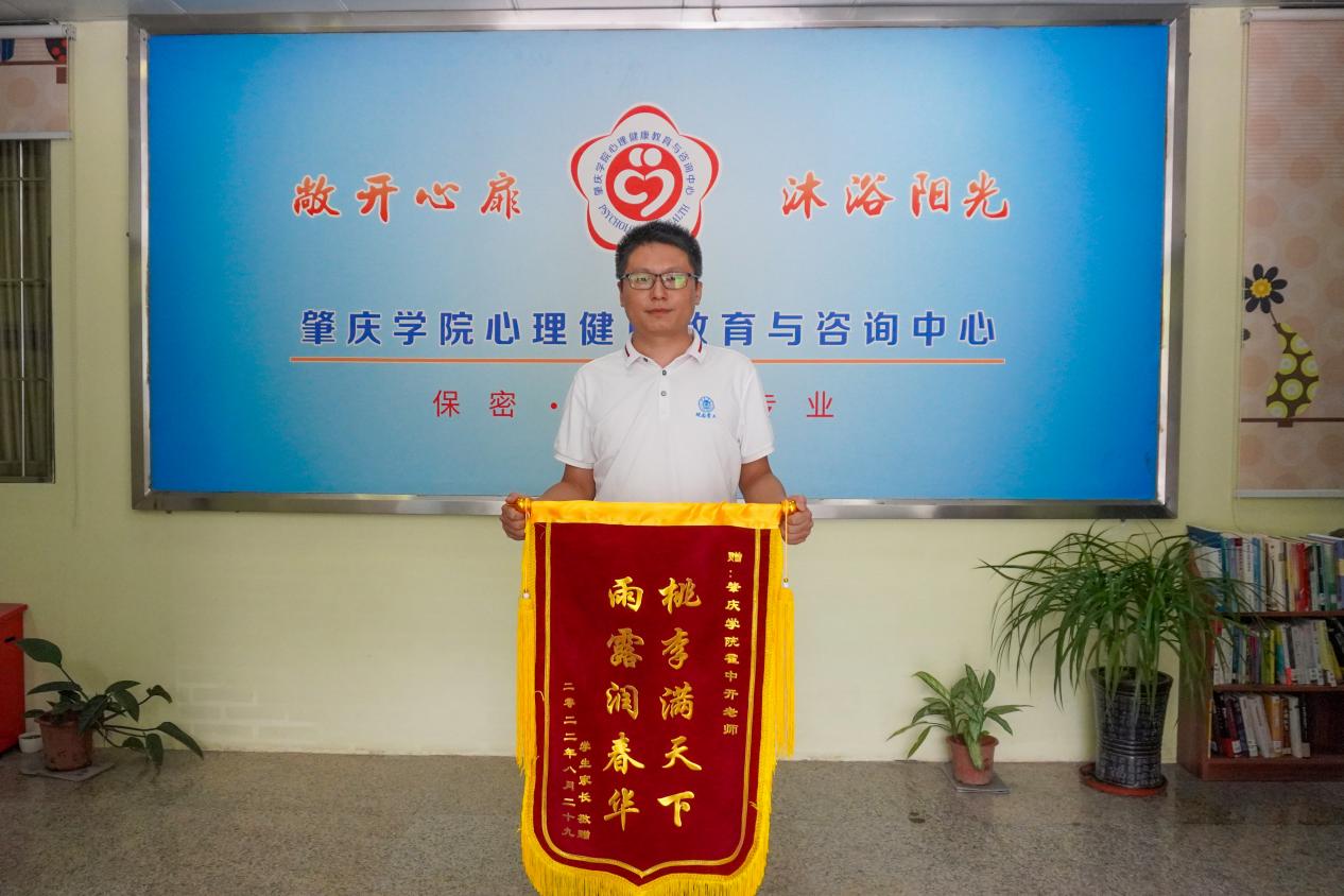 霍中开是心理中心的专职心理咨询师之一,主要负责为学生提供心理咨询服务和处理心理危机的工作。今年暑假,霍中开在心理中心的线上咨询平台收到一位学生家长的求助信息,了解到一名学生的心理正处于高风险的危机状态,一旦不及时加以干预,学生极易出现生命安全问题。由于当时情况紧急,他立即将此事上报学工处领导后,一边赶忙与同事商量治疗方案,又一边耐心地安抚学生家长的情绪。与同事商讨决定后,考虑到对孩子而言家长是更加亲近的人,霍中开提议让家长以孩子知心朋友的身份来开导学生,并针对学生在咨询过程中可能会出现的反应为家长提供相关的预案。在家校的共同努力下,一周后,学生的情绪恢复到相对稳定的状态。事后,为表示对霍中开的感谢,学生家长特赠了一面锦旗。