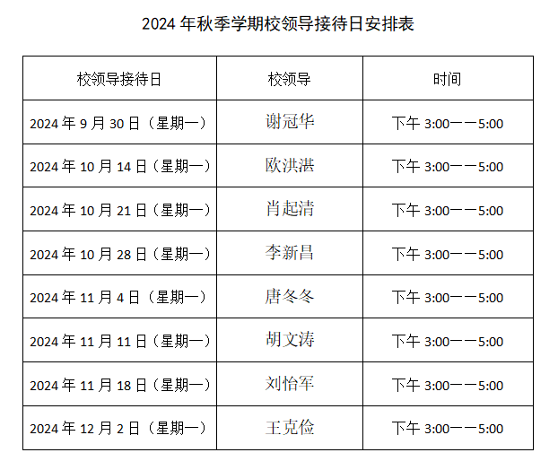 请有意来访的师生员工于校领导接待日的前一周周五下午17:00前填写附件1-《必赢242net官网校领导接待日预约登记表》并发送至电子邮箱huangzuxin@zqu.edu.cn进行预约,党政办公室协调安排后,将通知预约人具体接待时间。