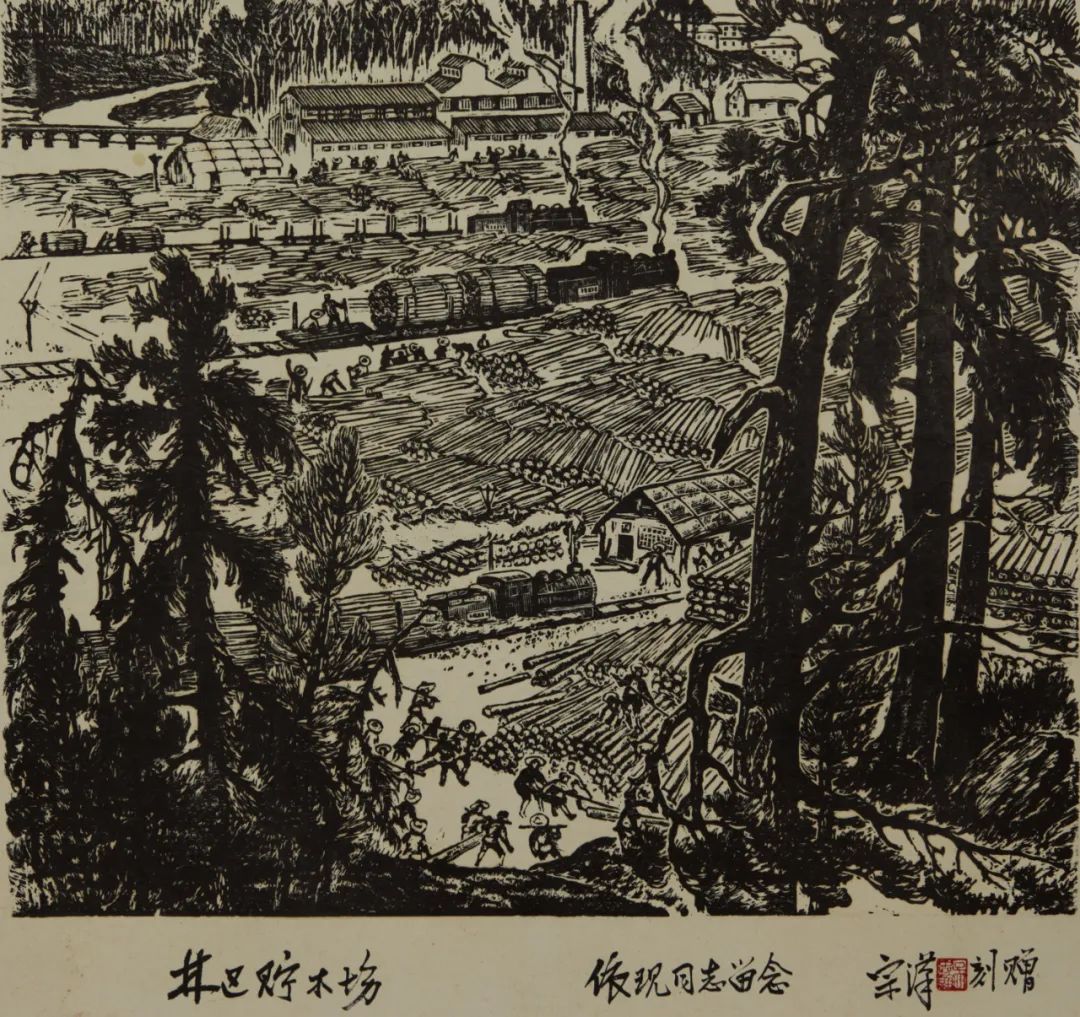 吴忠翰《林区贮木场》 黑白木刻 46cm×50cm