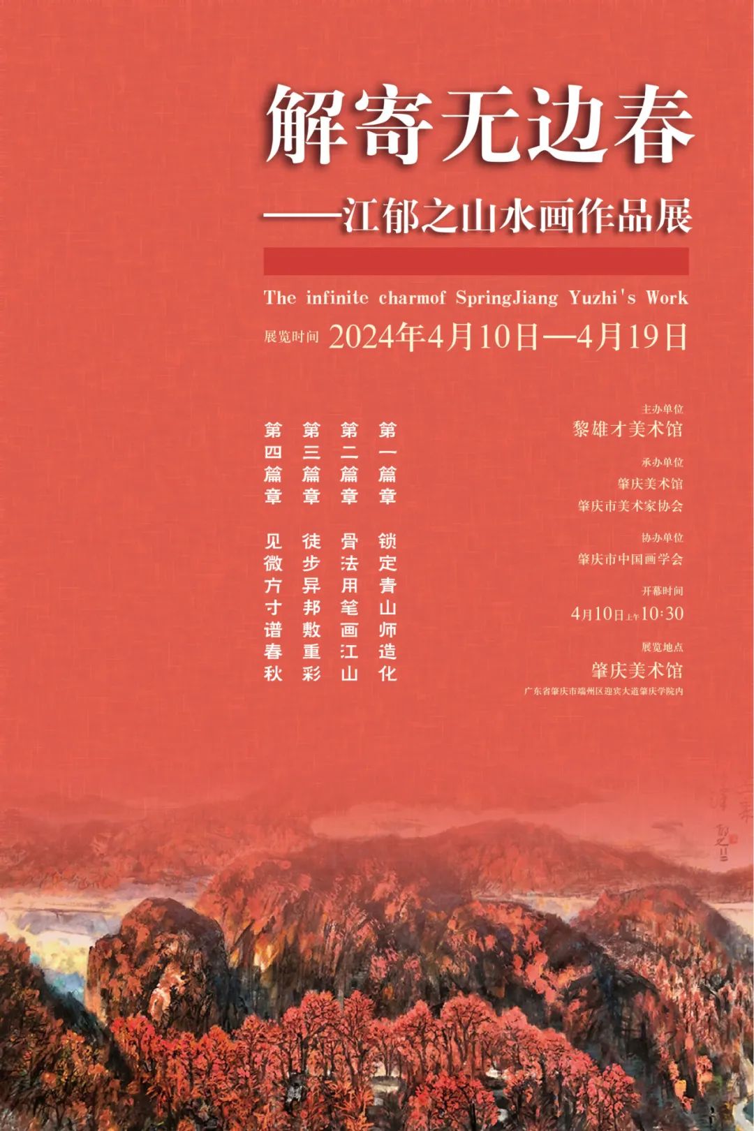 该展摘取苏轼诗中的一句“解寄无边春”一语为展标,旨在从江郁之先生近十年创作的百多幅“新山水画”出发,展现画家心中对山川大地的诗意表达。一方面,江郁之在广东美术界耕耘了几十年,有多个部门工作的经历,退休前曾任广东美术馆副馆长。早年从事连环画及油画创作,有一定的社会影响,后由于工作的需要从事美术馆的典藏与艺术品收藏工作,在相关领域表现突出。江郁之现已退休近八年,退休后全身心地投入到水墨艺术的创作之中,接受过新中国全新美术体系教育的他,试图尝试以中西结合的笔墨技法表达对大自然内心心象和外感内悟,创造出一个画家彼时彼地的专属自己的全新面目。另一方面,江郁之用笔强调方正精神和敦厚品格,作品以基本的朴拙、凝练之势,体现了蓬勃而又充实的生命力。江郁之笔意绵长、以一当十之笔墨表达中,足见其“解寄无边春”之后所付汗水、所历艰辛、所受寂寞之无以言传。唯有此才能创造出这无边春色。