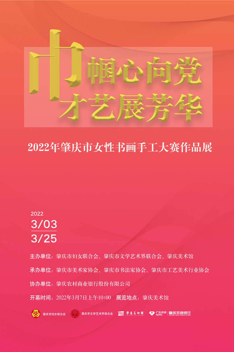 为深入贯彻习近平新时代中国特色社会主义思想,贯彻落实习近平总书记关于妇女和妇女工作的重要论述,传承中华优秀传统文化,弘扬工匠精神,助力乡村振兴,以实际行动迎接党的二十大胜利召开,在“三八”国际妇女节即将到来之际,我们举办了“巾帼心向党 才艺展芳华——2022年肇庆市女性书画手工大赛”。大赛由肇庆市妇女联合会、肇庆市文学艺术界联合会、肇庆美术馆主办,由肇庆市美术家协会、肇庆市书法家协会、肇庆市工艺美术行业协会承办,肇庆农村商业银行股份有限公司协办。