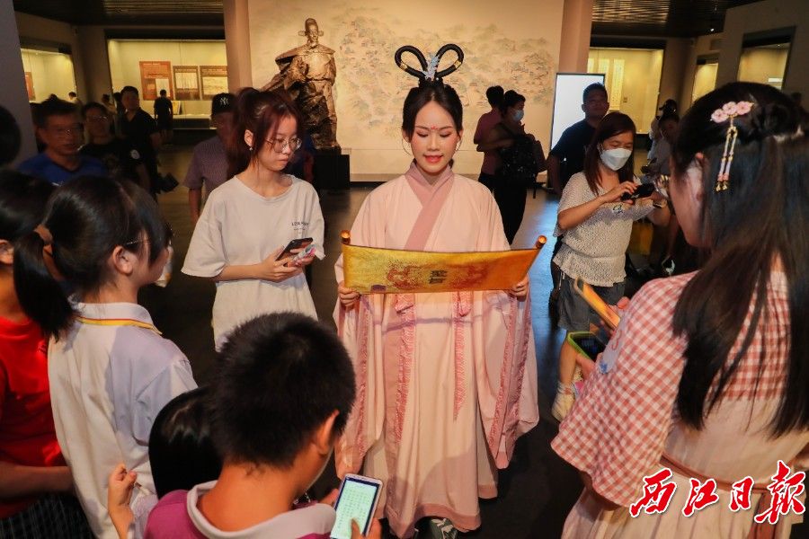 “各位君子,现在是大秦多少年啦?”8月26日,一名来自大秦的士兵“穿越”到肇庆市博物馆,带来一段关于遗落千年的食谱寻觅之旅,一出南朝才子佳人生死绝恋,一次民国白色恐怖绝境逢生………在一件件文物中,一幕幕拟真场景里,在文字解谜、实物寻宝、戏剧互动中,观众和演员共同演绎了一场亦幻亦真的裹蒸千年传奇故事。