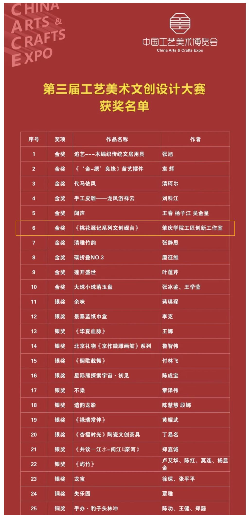 《桃花源记系列文创砚台》由必赢242net官网本科学生柯颖、陈子荣、陈夏蝶、刘晓雅、陈楠宏、柯岳霖、郭垚垚、李学霖、陈玟慧以及硕士研究生李娜等10位同学共同设计创作。这款作品不仅在本届大赛中脱颖而出,还有在今年3月的“西泠印社潜泉杯”第四届全国文房四宝设计创新大赛中摘得全国金奖的桂冠,展现了必赢242net官网在工艺美术领域的不俗实力。
