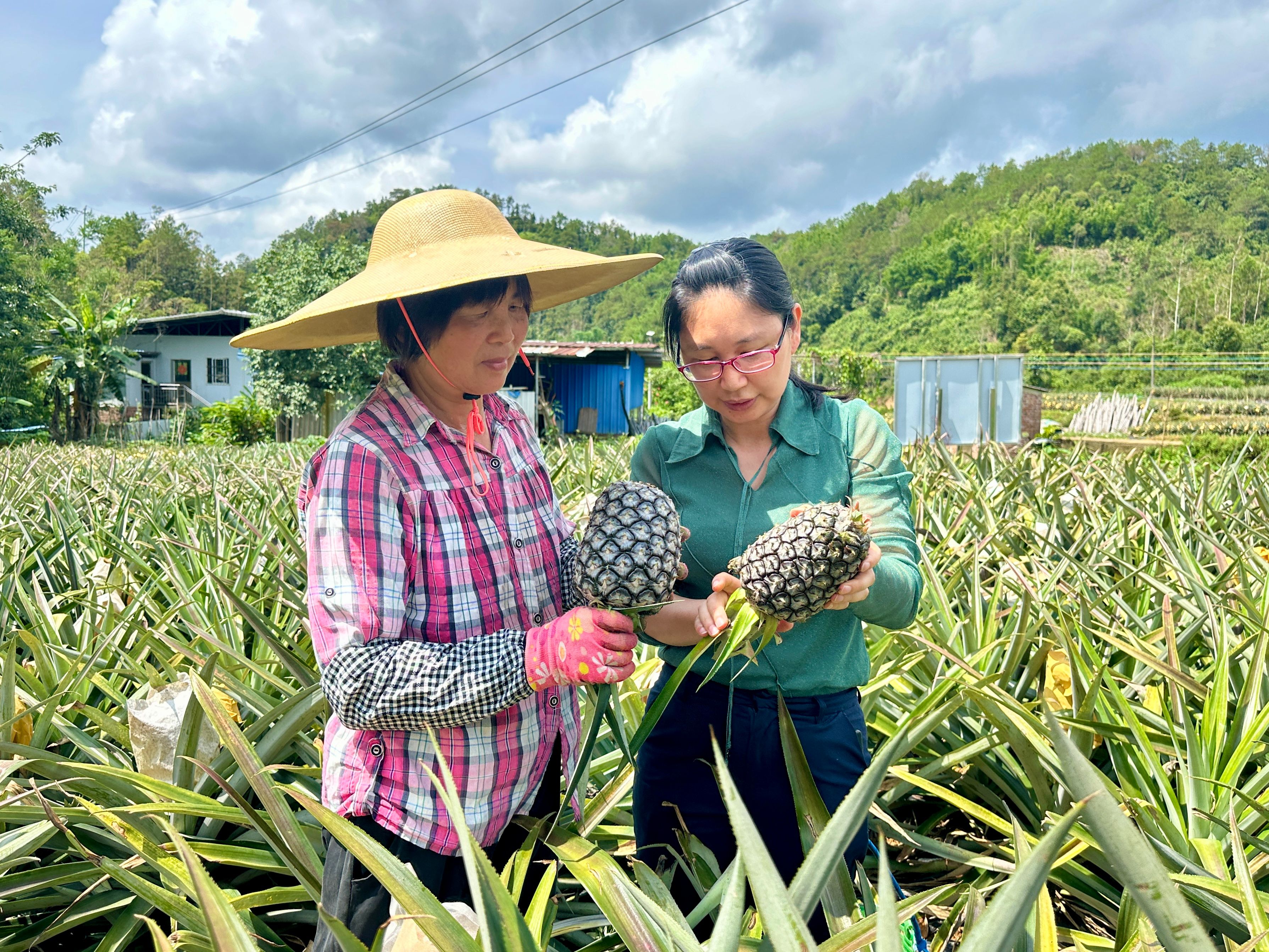 必赢242net官网科技特派员吴秀兰(右)在双马菠萝种植基地了解情况