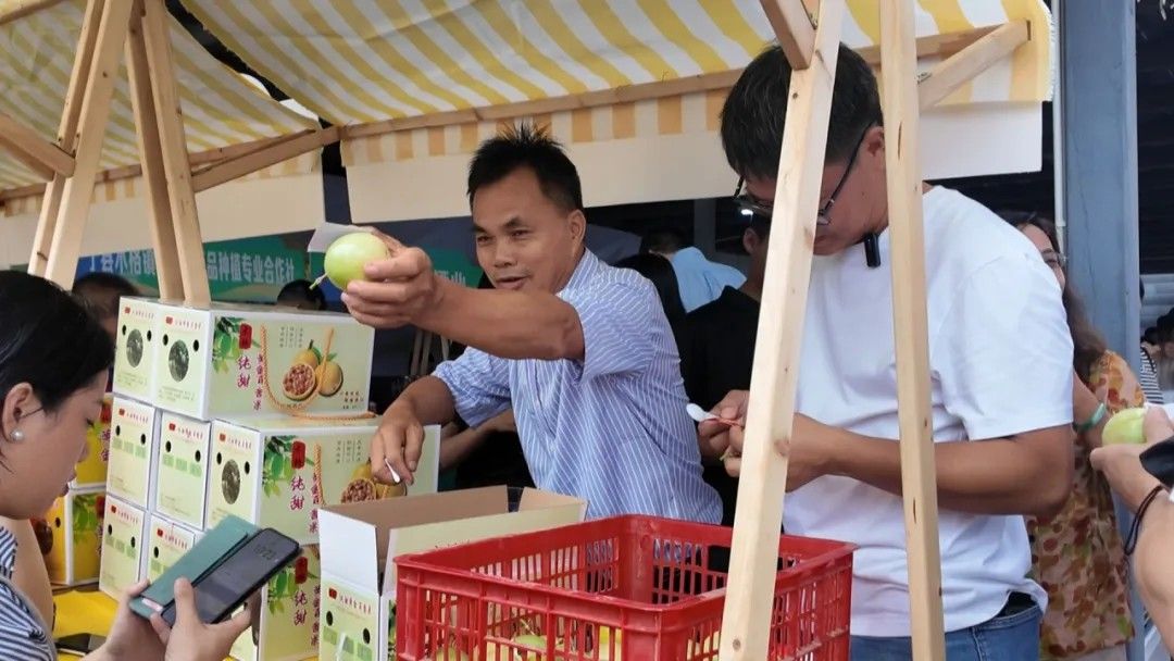 △市民游客在广宁县木格镇第三届黄金百香果产业暨富硒特优农产品推介活动选购黄金百香果。图源 广宁发布