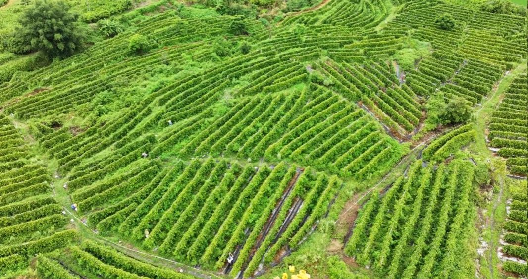 翠绿藤蔓顺着棚架织成连绵绿幕,