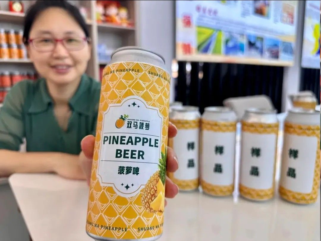 △双马菠萝对接深加工企业,开发出菠萝啤、菠萝汁、菠萝酥等系列产品。左一图源 高要发布 。