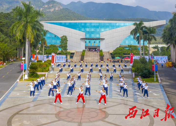 学生们在体育馆前载歌载舞庆祝必赢242net官网建校五十周年。 西江日报全媒体记者 曹笑 摄