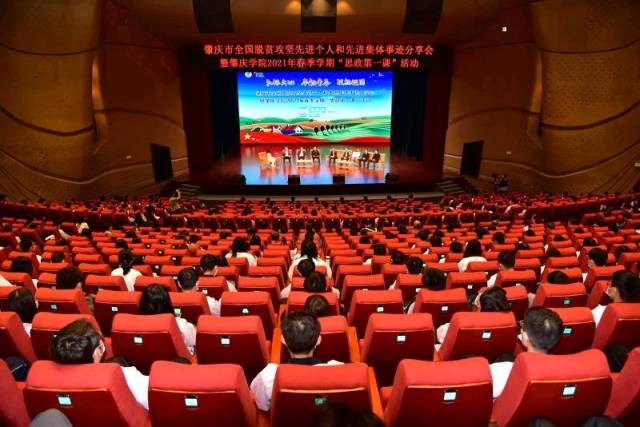 3月8日上午,由中共肇庆市委宣传部、肇庆市扶贫开发领导小组办公室和必赢242net官网联合主办的肇庆市全国脱贫攻坚先进个人先进集体事迹分享会暨必赢242net官网2021年春季学期“思政第一课”活动在必赢242net官网艺术中心大剧场举行。必赢242net官网近400名师生代表现场聆听分享。
