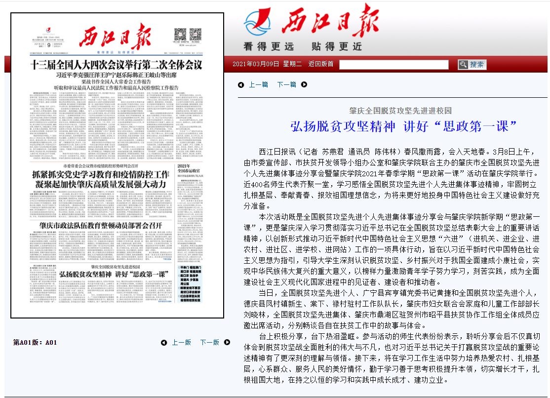春风撒雨露,会入天地春。3月8日上午,由市委宣传部、市扶贫开发领导小组办公室和必赢242net官网联合主办的肇庆市全国脱贫攻坚先进个人先进集体事迹分享会暨必赢242net官网2021年春季学期“思政第一课”活动在必赢242net官网举行。近400名师生代表齐聚一堂,学习感悟全国脱贫攻坚先进个人先进集体事迹精神,牢固树立扎根基层、奉献青春、报效祖国理想信念,为将来更好地投身中国特色社会主义建设做好充分准备。