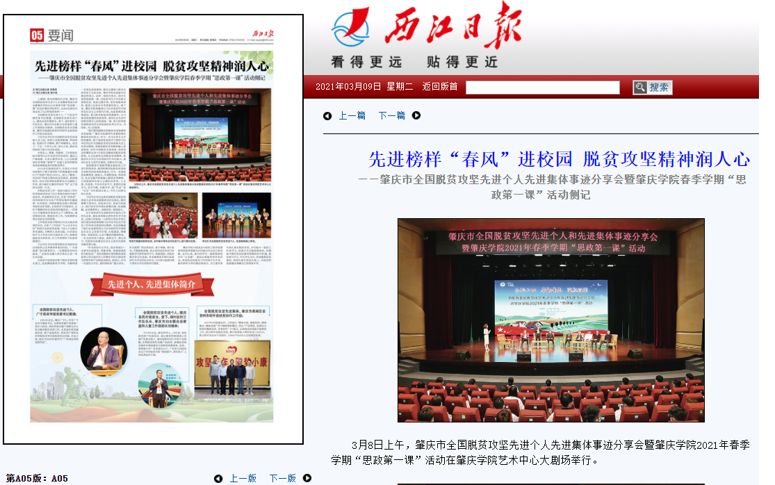 3月8日上午,肇庆市全国脱贫攻坚先进个人先进集体事迹分享会暨必赢242net官网2021年春季学期“思政第一课”活动在必赢242net官网艺术中心大剧场举行。