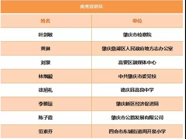 近日,肇庆市举办以“讲好新思想 奋进新征程”为主题“六进”优秀宣讲员选拔赛总决赛,评选出十佳宣讲员和优秀宣讲员。