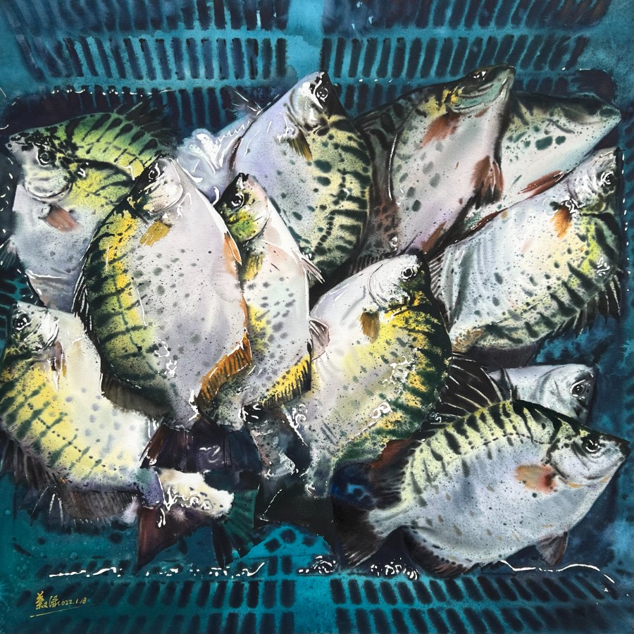 生活之美在于发现,形式之美在于创造。作品展现场,一幅栩栩如生、活灵活现的银鼓鱼水彩画展现在眼前,银鼓鱼的水彩画宛若一台高清相机拍出的生动作品,让人在画框前仿佛置身“海鲜市场”,窥见了广阔神奇的深海生物。水彩画《海泽舌尖之二》的作者叶又绿告诉记者,这幅画是他在珠海的一家海鲜批发码头创作的,“运用中国画的毛笔来创作水彩画,可谓是中西合璧,画面上每条鱼的下笔特别酣畅淋漓,一气呵成,画面的形式感‘水’的味道很足。”