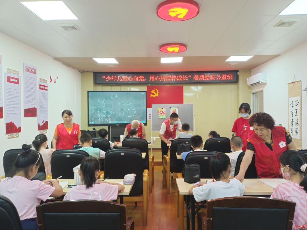 站北社区”大党委“成员“五老服务队“带领辖区孩子过暑假写学绘画。.jpg站北社区”大党委“成员“五老服务队“带领辖区孩子学绘画。 西江日报记者 夏紫怡 摄
