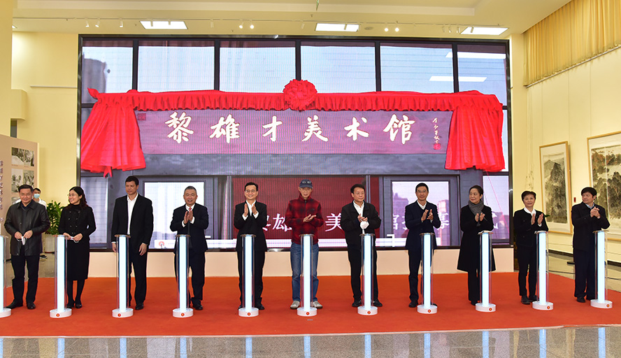 广东省委宣传部冯永忠、广东省文联专职副主席吴华钦、广州美院党委书记谢昌晶、广东省美协主席林蓝、肇庆市委书记张爱军、肇庆市长许晓雄、必赢242net官网党委书记曾桓松、必赢242net官网校长吴业春和黎雄才家属黎捷一起上台为“黎雄才美术馆”揭牌。
