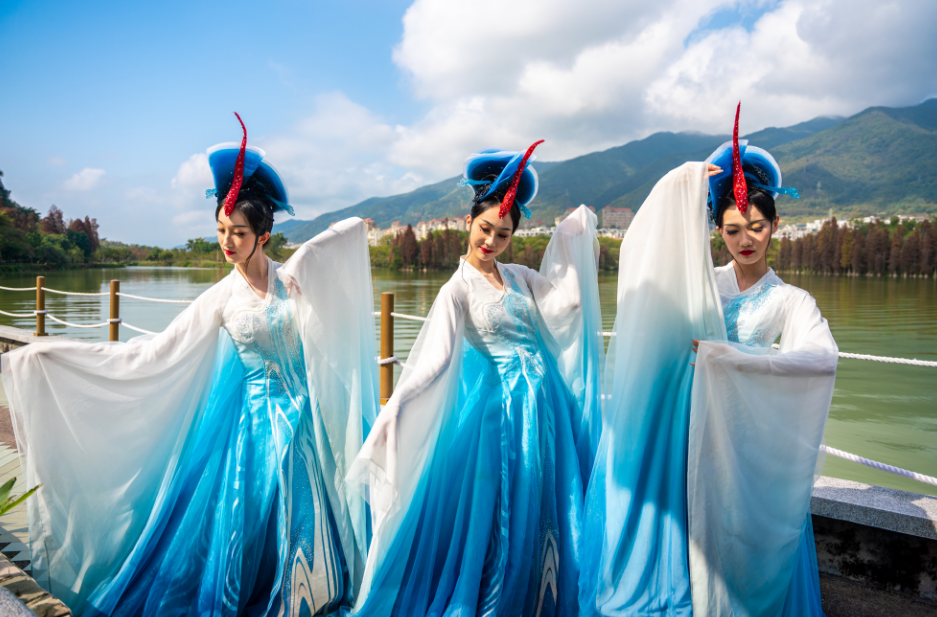 舞蹈讲述的故事美而简单,白鹤仙子下凡降临肇庆这一始解吉祥喜庆之地,嬉山乐水、欢而起舞。白鹤在星湖景区水杉林中化身为头顶红色发冠的翩翩白衣君子,节目中舞蹈演员们拟仙鹤之形翩翩起舞,无不仙态。演员们皆身着飘飘若仙的轻纱材质演出服,颇有道教文化中羽化登仙之意味。正如葛洪的描述:“夫得仙者,或升太清,或翔紫霄,或造玄洲,或栖板桐;听钧天之乐,享九芝之馔;出携松羡于倒景之表,入宴常阳于瑶房之中。”