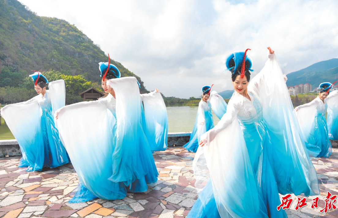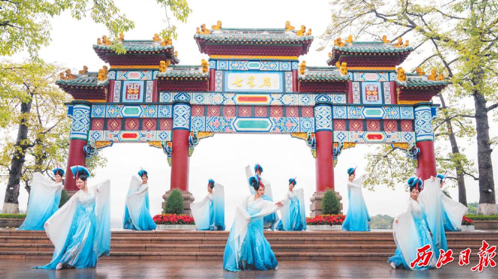 压轴出场的《瑞鹤归》中,瑞鹤少年和仙女穿越千山万水,选择落足肇庆,在山水中翩翩起舞,体现了“山湖城江峡”生态格局塑造了肇庆独具特色的绿色生态文化,彰显了山、湖、城、江、峡等肇庆绿色生态文化最靓丽名片。“观众跟随瑞鹤随着《云起楼图》开始山水之旅,‘仁者乐山,智者乐水’,人生有限,山水永恒,人的品德和山水相互比拟,同时开启比德之旅。”他表示,随后,山水、牌坊、石刻、楼阁、宗祠这些舞美背景,以典型的肇庆历史和文化符号为脉络,带领观众登山上峰顶,涉水寻源头,开启一场历史和文化旅程,领略着“岭表南来第一州”和北回归线上的绿洲的风采。