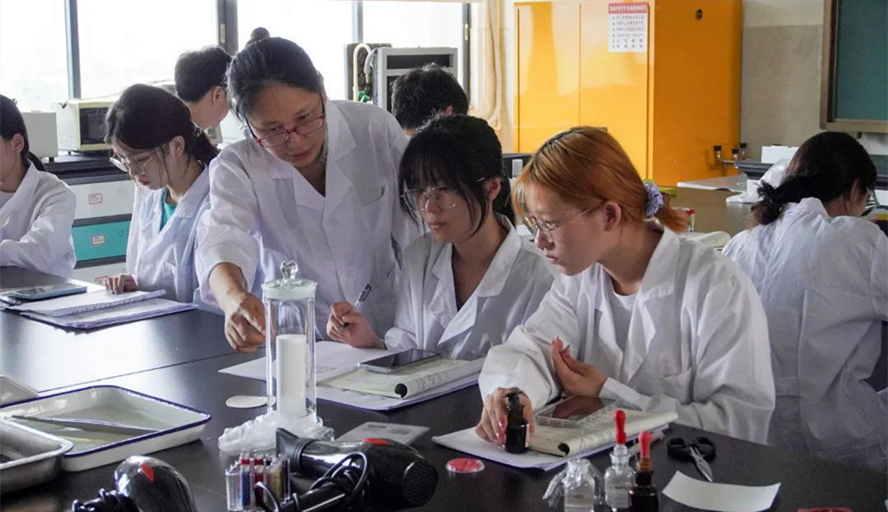 本网讯 阳光透过窗弦,在食品与制药工程学院的一间实验室里,一位实验室员打扮的女教师正手握试管,紧盯刻度,缓缓地往试管里滴加试剂。她的目光聚焦在试剂的合成反应上,观察着试剂颜色逐渐变化,等待着实验结果呈现出来……
