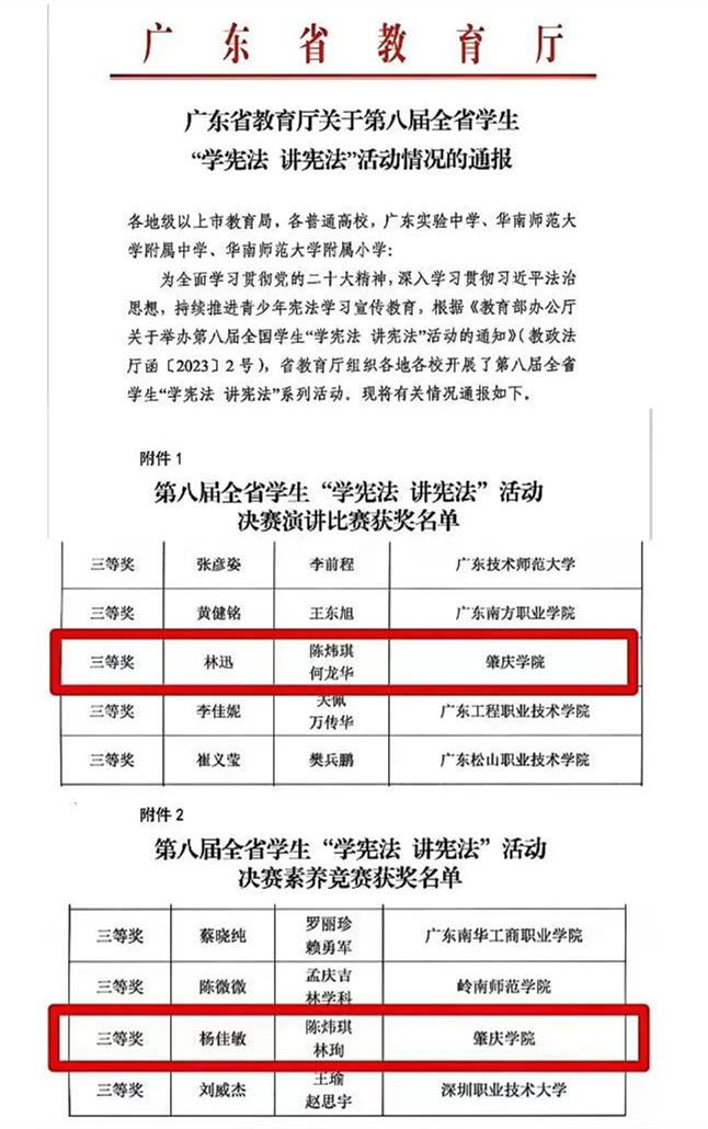 星光璀璨,宪法同行。为全面学习贯彻党的二十大精神,深入学习贯彻习近平法治思想,推动青少年宪法宣传教育常态化长效化,省教育厅举办第八届全省学生“学宪法 讲宪法”活动。经过紧张激烈的角逐,我院林迅同学获得演讲比赛高校组三等奖、杨佳敏同学获得素养竞赛高校组三等奖。