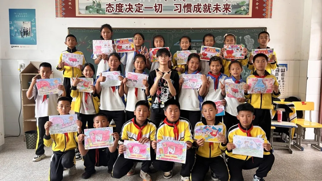 下乡期间,他跟随团队深入怀集县下帅乡民族学校,进行校园书画教育;同时,他们创作了党史题材相关作品,并赠予当地村民;援藏期间,他们为当地的小学生们清洗头发、修剪指甲、开展兴趣班教学。每一次志愿活动,他都在用实际行动传递爱心与温暖。