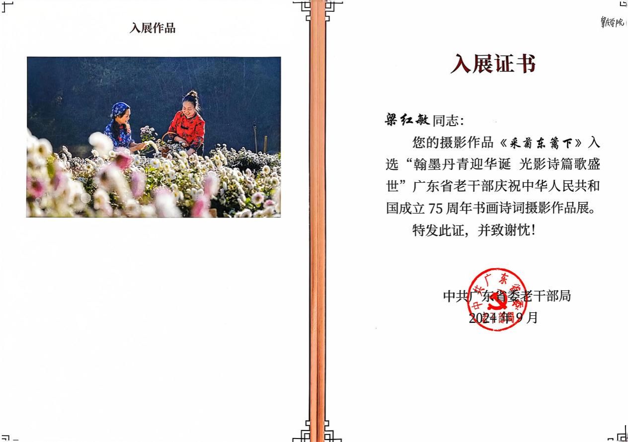 本网讯 近日,离退休党委传来喜讯,退休教工梁红敏、夏笑娟的摄影作品入选“翰墨丹青迎华诞 光影诗篇歌盛世”广东省老干部庆祝中华人民共和国成立75周年书画诗词摄影作品展并荣获入展证书。