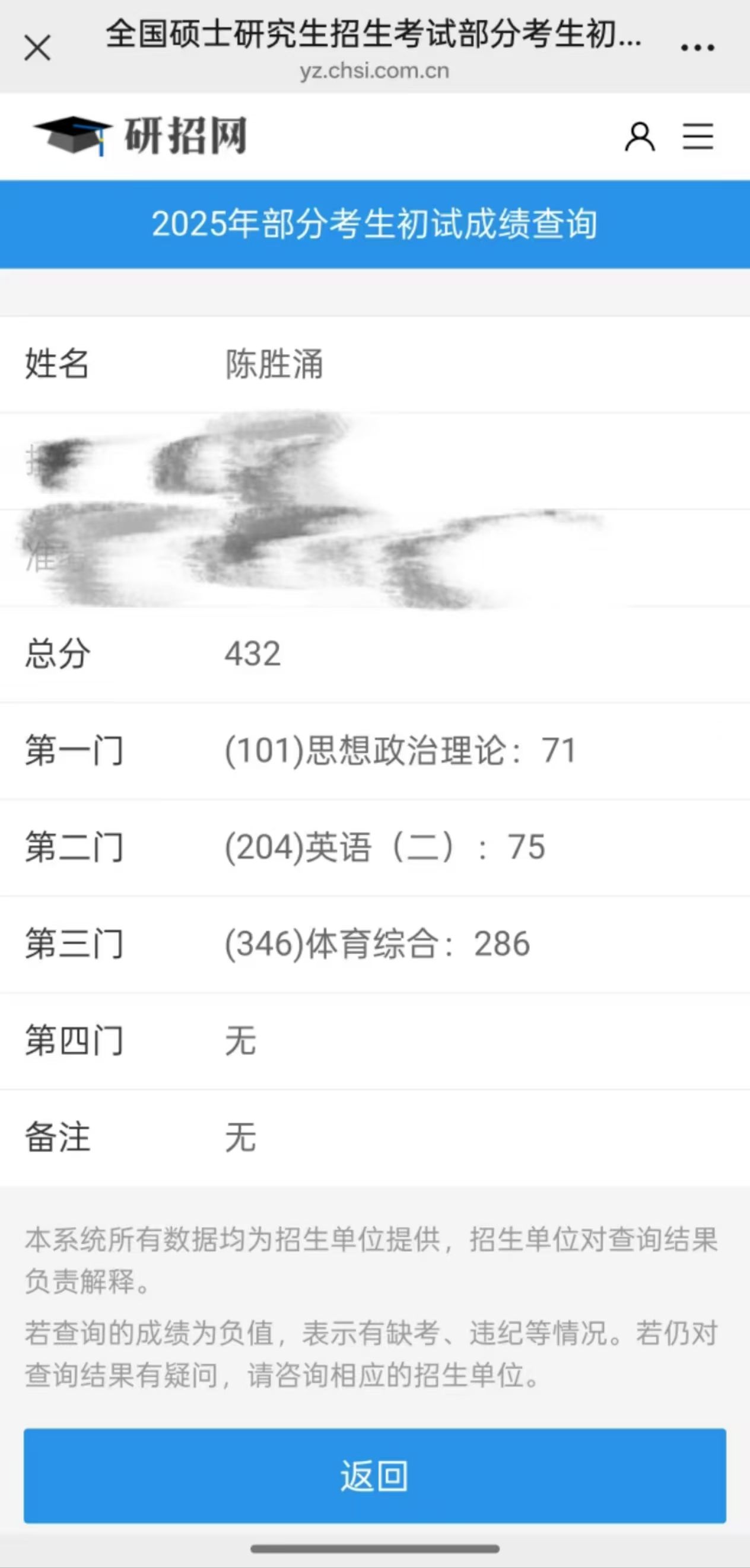本网讯 2025年9月,体育学院首批硕士研究生即将入校就读。而在这批新人中,陈胜涌的名字犹如王冠上的明珠一样熠熠生辉,他不仅在初试中考出了432分的好成绩,并以复试成绩89.7分拿下了第一名,让自己手中的这张“研”途之旅的入场券无比闪耀。