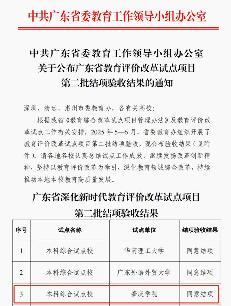 本网讯 学校深化新时代教育评价改革试点校项目建设时间为2021-2025年,建设周期为5年。2025年5月广东省教育厅开展了教育评价改革试点项目验收工作,学校报送了教育评价改革试点校结项审批表等材料,6月省教育厅公布了结项名单,我校深化新时代教育评价改革试点校项目顺利结项。