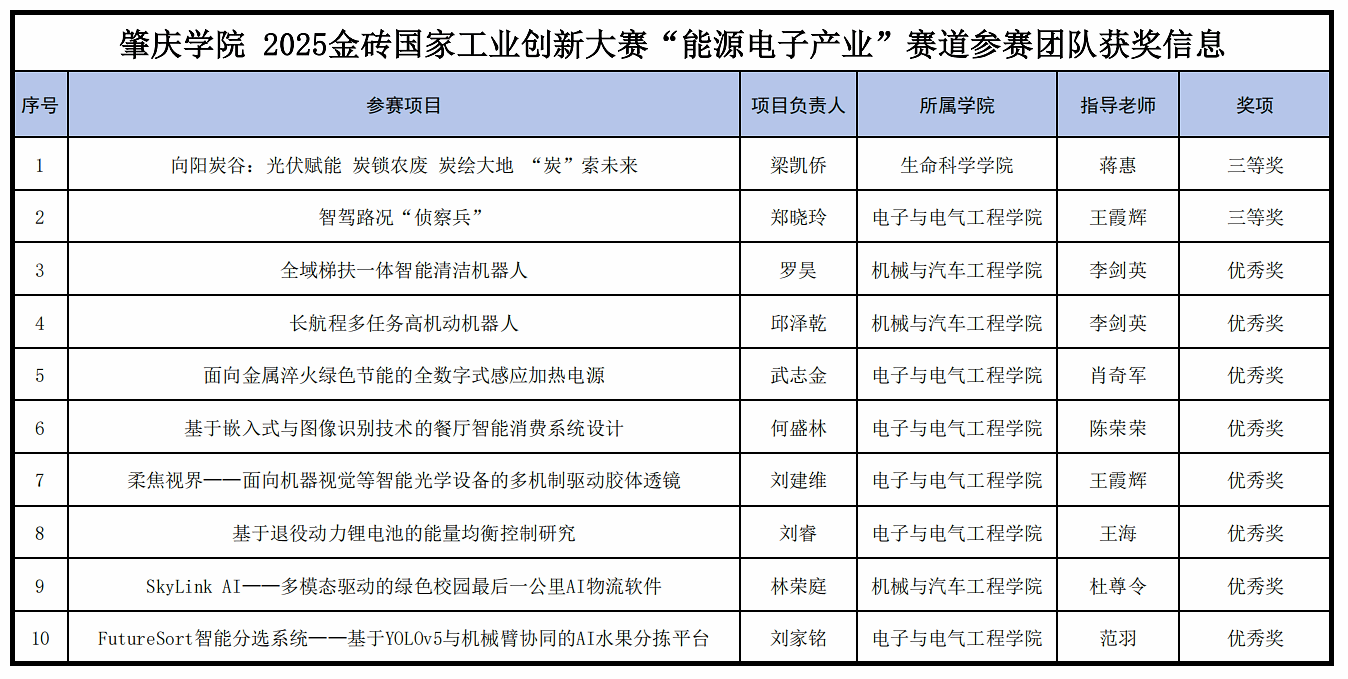本网讯 8月20日至21日,2025金砖国家工业创新大赛“能源电子产业”赛道选拔赛于广东肇庆举行。由创新创业学院组织,来自电子与电气工程学院、机械与汽车工程学院等二级学院组成的师生参赛团队表现优异,共有10个项目成功入选本次选拔赛。其中,《向阳炭谷:光伏赋能 炭锁农废 炭绘大地 “炭”索未来》与《智驾路况“侦察兵”》凭借其创新的技术理念、扎实的研究基础、良好的应用前景,荣获大赛三等奖。其余8个项目也以其独特创意和潜力获得优秀奖。