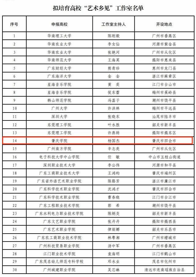 本网讯 近日,广东省“百千万工程”指挥部“双百行动”专班办公室正式发布《2025年高校“艺术乡见”工作室拟立项(培育)项目名单》。我校科学技术部杨国杰副教授主持的“乡村美学工坊工作室”成功入选省级培育项目。