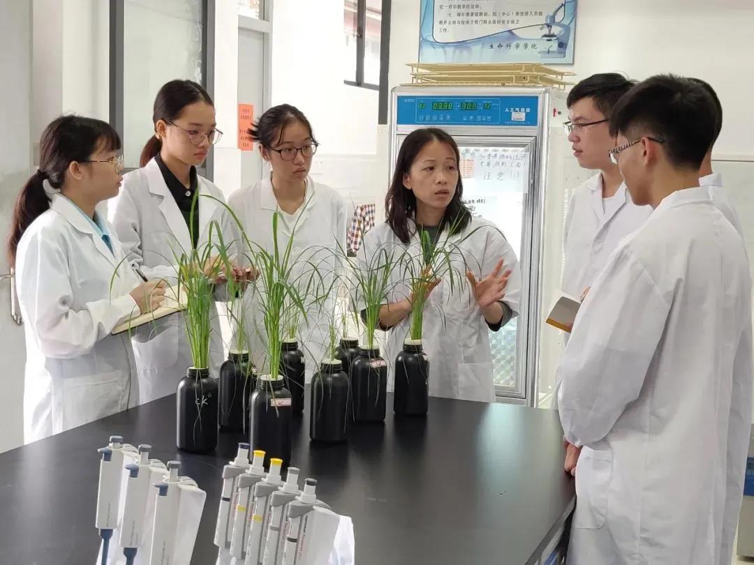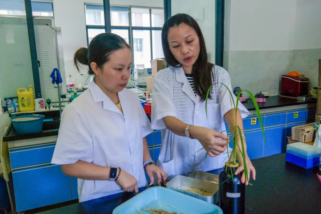 其次是工作的开展。培养水稻等植物材料生长缓慢,受季节限制大,为满足实验材料的需求必须大规模种植,但是又与转基因涉及的伦理知识相悖;科研的基础设备与仪器跟不上研究的步伐,缺乏指标性策略做支撑;同时又因为疫情影响,学生在假期期间不能留校做实验……重重关卡,俞乐与她的团队一一破解。不能大规模培养材料,就在我校生物园大田基地种植,发展人工气候项目;水稻受季节限制大,怕错过了水稻生长的最佳时间,老师和学生便主动缩短假期,轮流回校看护水稻;基础设备和仪器跟不上,俞乐便亲自送样,奔波于广州的各个合作机构;缺乏指标性的策略,俞乐和她的团队就慢慢研究摸索……关关难过关关过,长路漫漫亦灿灿。