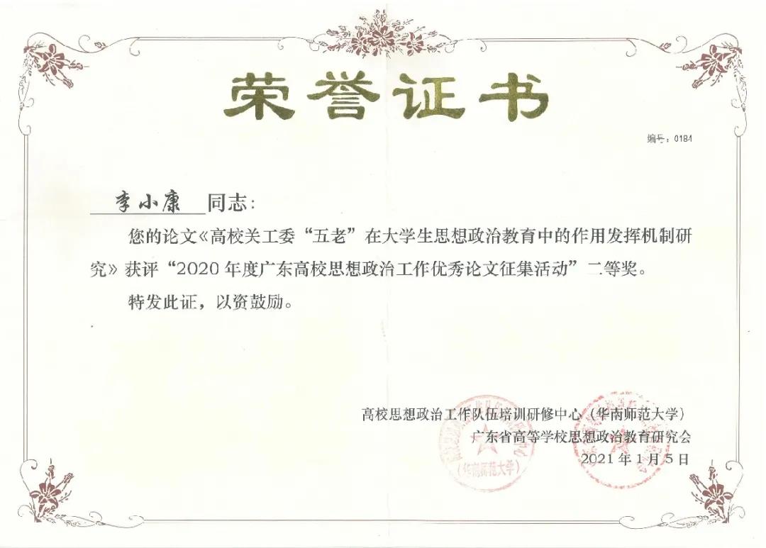 “广东高校思想政治工作优秀论文”二等奖