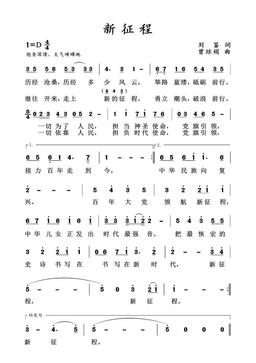 歌曲《新征程》以饱满的赤子之情和时代激情,表达了人民群众对党和国家的热爱,讴歌了中国共产党在民族复兴伟大征程中的奋斗风采。质朴的歌词,如歌如诉,回忆党的历程,字里行间充满对党和人民浓浓的情感。