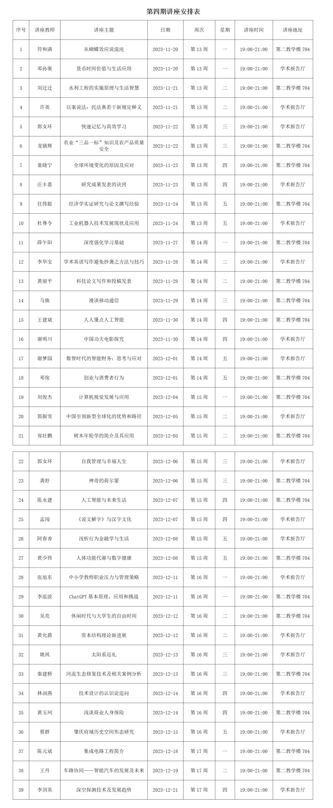 为拓宽学生知识面,提高学生综合素质,促进学生成长成才。2023秋季学期“砚园大讲堂”讲座共有四期,其中第一期第1~2周(已结束)、第二期第3~7周(已结束)、第三期第8~12周(进行中)、第四期第13~17周(11月15日开选)。现将第四期讲座的修读事宜通知如下: